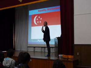 シンガポールは、近年のOECD「生徒の学習到達度調査(PISA)」でも上位にランクされ、日本以上に厳しい受験競争がある。また、日本以上に地下資源に乏しく、人材が国を支えている。講演では、日本の教育事情との比較も交えながら、シンガポールの教育事情や人材活用についてお話があった。1年生の生徒たちは、今年の10月に修学旅行でシンガポールを訪問することもあり、国政に携わった方からのお話に興味深く聞き入っていた。講演後、生徒からの質問も出て、シンガポールへの理解が一層深まったように思えた。