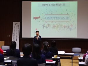 次に講義・実習①として、江上いずみ本学客員教授の「グローバルマナーとおもてなしの心」についての講義と実技指導が行われました。握手や挨拶等、グローバルマナーやおもてなしの心を表す態度について、実習を通して具体的に楽しく学びました。