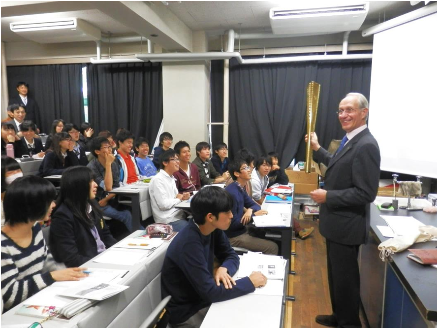 ロンドンオリンピックの聖火リレーにも参加したナヴァセル氏は、そのときのトーチを持参され、そのトーチが教室内を回る中で展開された授業のテーマは、「日本スポーツの発展過程-嘉納治五郎と東京高等師範学校の功績」であった。