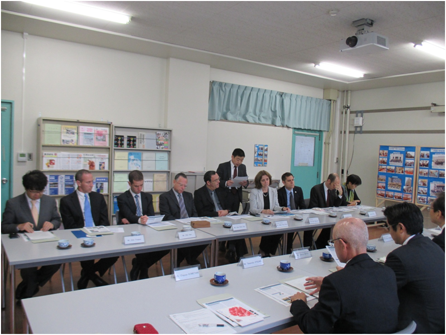 一行は、到着後、日下部副校長より同校概要及び鎌倉教諭より同校のSGHの取り組みに関する説明を受け、大川一郎校長ら関係者と教科教育や情操教育の指導方法などに関する情報交換を行った。とくに教科教育の面では、英語科で伝統的に取り入れているオーラルメソッドに興味を示され、理科や地歴・公民科で取り組んでいる論理的な思考力の育成については質問がなされた。