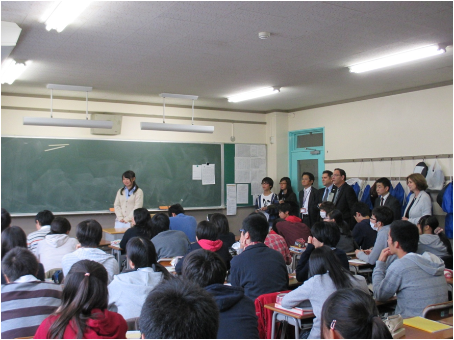 その後、藤原宏之教諭、ロバート・ジュベ講師による1年生の英語の授業を参観し、(ラビ)シャイ・ピロン大臣からは、教員の教え方が熱心で、活気のある授業を行っているとの感想があった。