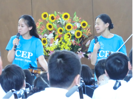 演奏者は、同法人の理事長で日本が世界に誇るヴァイオリニスト五嶋みどりさんのほか、ガヒョン・チョウさん(韓国出身、ヴァイオリン)、ウィリアム・フランプトンさん(アメリカ出身、ヴィオラ)、マイケル・カッツさん(イスラエル出身、チェロ)の4名。このカルテットは、同法人がアジアの子どもたちに本物の音楽を伝えるための活動(ICEP インターナショナル・コミュニテ―・エンゲージメント・プログラム)のために結成され、昨年ミャンマーでの演奏活動を終え、本年は忙しい合間を縫って、日本各地の学校を精力的に回っている方々である。小1から高3まで年齢幅のあることに配慮され、演奏の途中には楽器紹介や楽器クイズを挟むなど飽きがこない工夫をされながら、息の合った見事な演奏で児童生徒を魅了した。