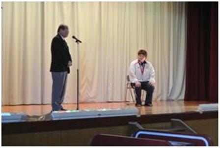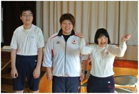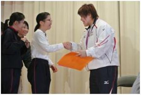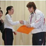 当日は、「ウアー本物だ!!」「かわいい」などの生徒の声が飛び交い、また喜びのあまり泣き出してしまう生徒もいた。「くじけそうなことがあっても、あきらめず、笑顔でがんばれば大丈夫!」という杉本選手の話を聞いて、これからのがんばりを誓うとともに、一生の思い出になる一日となった。