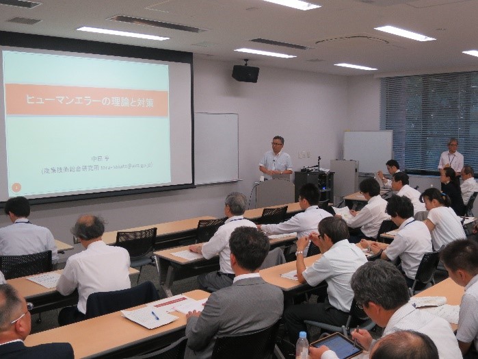 講師には産業技術総合研究所 人口知能研究センター 知識情報研究チーム長の中田 亨 博士を迎え、「ヒューマンエラーの理論と対策」をテーマに、①ヒューマンエラーを防ぐ3つの力、②正直な告白が事故を防ぐ、③こんなチェックはミス多発、④ゾーニングと物体化とポップアップ効果、⑤やり忘れを無くす方法、⑥ミスしやすい表計算の例、⑦マニュアルの書きかたのツボ、⑧簡単報告、⑨パフォーマンスとモチベーション、⑩根本はマネジメントなど、実践的な事例を交えながらヒューマンエラーを防ぐ理論と対策のお話しがありました。その後の質疑応答では、実際の事例からヒューマンエラーへの対応はどうしたらよいか、職場でのトレーニングはどうしたらよいか等について意見交換を行い、講師から具体的で実践的なご助言をいただきました。予定した時間を越えましたが、職場の明るさ・風通しのよさが最重要であることなどの理解が深まり非常に有意義な危機管理研修でした。