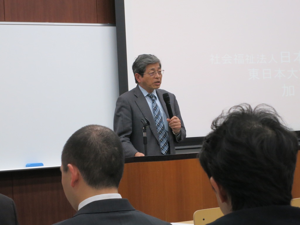13時から開催された第1部講演では、加藤俊和氏(日本盲人福祉委員会東日本大震災支援担当)が「視覚障害者の犠牲と困窮を軽減する防災への対策-理療の役割と幅広い支援-」をテーマに講演。「被災地で視覚障害者の理療専門家(施術者)の方々は、もっと復興支援に参加できる。特に避難所等でのあん摩・マッサージの治療奉仕が重要。」と語った。