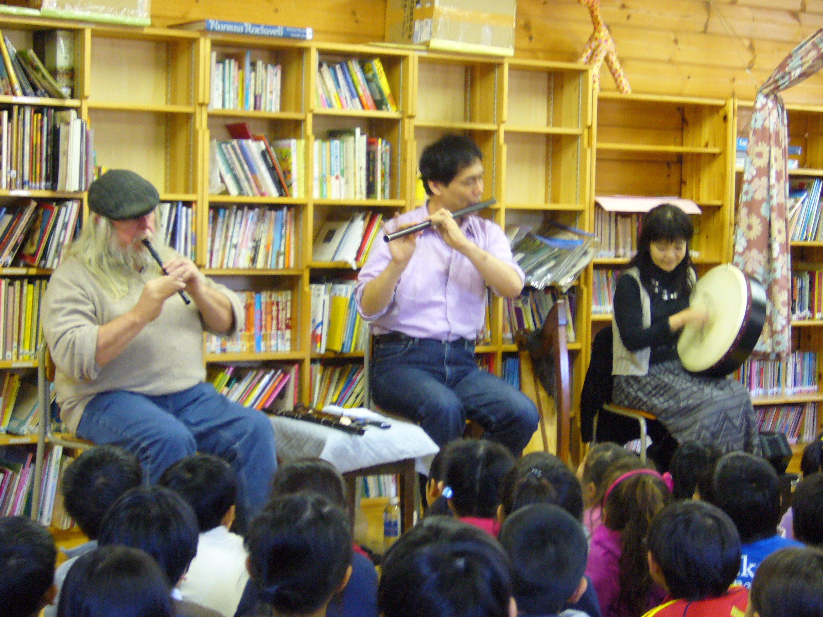 アイルランド音楽演奏家のShaun Ryan氏、守安 功、雅子ご夫妻の演奏を全生徒、教職員とともに鑑賞した後、TISのShaney Crawford校長の案内で、校内を見学した。教室では、子供たちに語りかけ、学校生活について話し、つくば市内の他の中学生とPCを使って英語でディスカッションをしている生徒たちの様子を見学した。