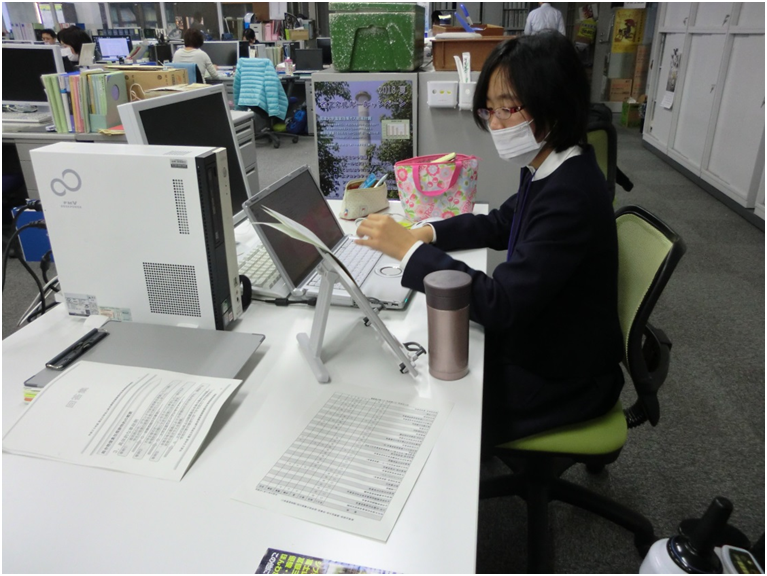 初日に簡単な職場説明を受けた後は、会計課と学校支援課からあらかじめ用意された住所録やパワーポイント資料の作成を行い、文字の変換作業に戸惑いながらも職員の指導を受けながら完成させていた。研修中は関係する部長室で職員との昼食会も行われ、車いすや芸能人の話題で楽しいひとときを過ごし、最終日には職場体験の報告会が行われ、双方にとってとても有意義な3日間となった。