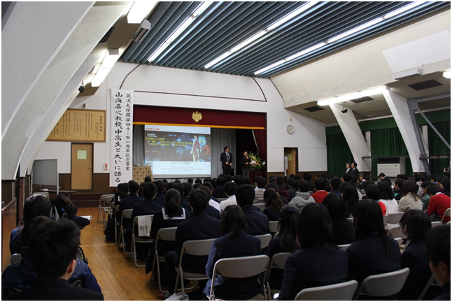その後、質疑応答・討論があり、生徒たちからは、「今後、ロボットスーツHALに加えたい機能は何ですか?」、「人だけではなく、動物を対象としたロボットスーツの応用も考えていますか?」、「HALのデザインを変更する予定はありますか?」等々予定時間を超える積極的な質問が数多く出され、山海教授は、生徒たちから出た質問について、最先端の研究も含めて分かりやすく答え、最後に、「人や社会に役立つことの重要性」そして「未来をつくるのはあなたたちですよ」というメッセージを伝えた。
