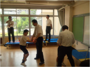 その後、修繕が予定されている塗装の剥離箇所や階段踊り場、豪雨時に逆流や浸水がおこる幼稚部トイレ、作業棟等の危険箇所を中心に校内を見学した。