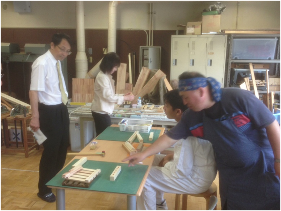 永田学長は、幼稚部から高等部までそれぞれの授業を見学したが、小学部は、東京学芸大学附属竹早小学校との交流日であり、授業交流「合同音楽」において、学長が児童と一緒に交じりダンスを行う場面も見られた。また、高等部において木工作業や皿作りをする生徒達から、出来たての作品をお土産に手渡され、作品の出来映えにとても感心していた。