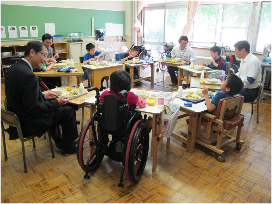 授業見学後、給食を小学部4年の教室で児童とともに取り、恐竜の遺伝子やアイドルグループなど様々な話題で盛り上がり、楽しいひと時を過ごした。