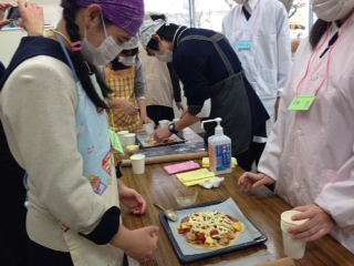 スポーツ班は、フロアバレーボールで真剣勝負をし、調理班はピザとフルーツ白玉づくり、おいしそうなピザやダイナミックなピザなど、いい匂いが立ちこめていた。トーク・レク班は、フラフープくぐり、スプーンレースなどの独創的なゲームで盛り上がっており、いずれの班でも共に活動する中で、自然な関わり合いが生まれていた。