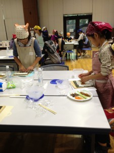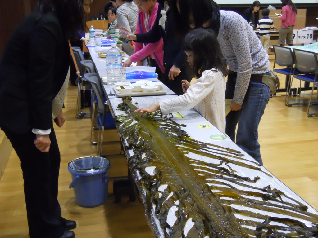当講座は、このような日々の実践の成果を踏まえ、附属視覚・大塚・桐が丘特別支援学校の栄養教諭が中心になり、食への関心を高めるきっかけとしたいと企画・運営した講習である。同内容で3回実施したが、定員の2倍の申込者があり、抽選で選ばれた小学生とその保護者が食育講習に楽しく参加した。知っているようで知らない食材「乾物」を取り上げ、元の姿はどのようなものか、調理の段階で形、質感、匂いなどがどのように変化していくのか、スライドを使った説明の後、クイズに取り組みながら、かつおぶし、かんぴょう、高野豆腐、わかめなど見たり、触ったりして、食材の不思議さを実感していた。昆布やわかめの大きさにびっくりしたり、高野豆腐や干し椎茸を水で戻した時の質感・重さの変化を発見したりした。その後、乾物を使っての巻き寿司づくり、初めて挑戦する子どもたちも、巻きすを使って上手に巻き上げていた。自分でつくった巻き寿司の味は格別!あっという間に平らげていた。