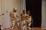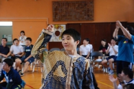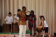 今回は、劇団四季「ライオンキング」初代パーカッション奏者のB.B.モフラン氏のバンドのライブ演奏に合わせてアフリカの音楽やダンスを体験するというイベントで、中学部の3年生が中心となり素敵な衣装をまとって力強いダンスを披露し、その後、全校の子供たちもパーカッションのリズムにのってダンスを楽しんだ。