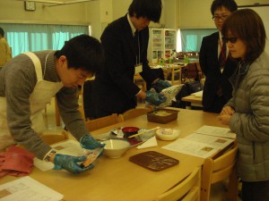 今回の「寄宿舎 研究・実践交流会」は、寄宿舎における生徒指導等の実践を交流し、実践に活かすことを目的として、初めて開催したが、北は岩手から南は福岡まで全国の視覚特別支援学校の寄宿舎指導員等が参加した。午前中は、寄宿舎における学習環境の保障、外出許可について、門限について、歩行指導など、多岐にわたった協議が行われた。午後からは、本校寄宿舎生徒の調理に対する意識・実態などを踏まえて取り組んできた「火や包丁を使わない調理」の実践研究成果をもとにした「簡単調理レシピ」を紹介した。その後、参加者でレシピをもとに、調理のポイントや配慮事項を確認しながら、電子レンジを使用した親子丼、鮭のチャンチャン焼きをつくり、試食をした。