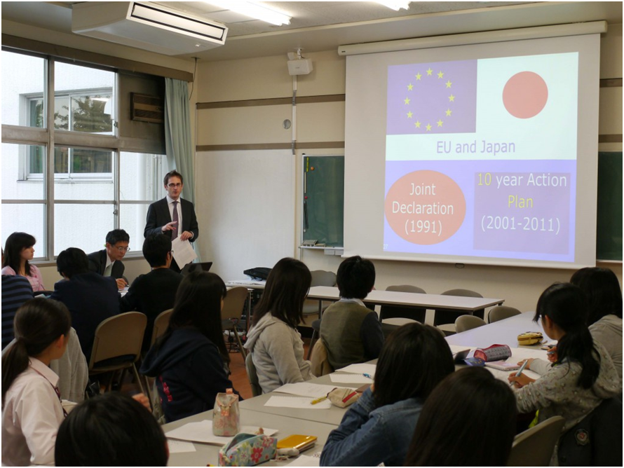 講義はすべて英語で行われたが、生徒たちは、普段知ることの少ない欧州連合の成り立ちや、現在抱えている金融危機の実態について熱心に耳を傾けていて、講義後の英語での質疑応答においても、たくさんの質問がなされ、EUに関する生徒たちの関心の高さがうかがえた。