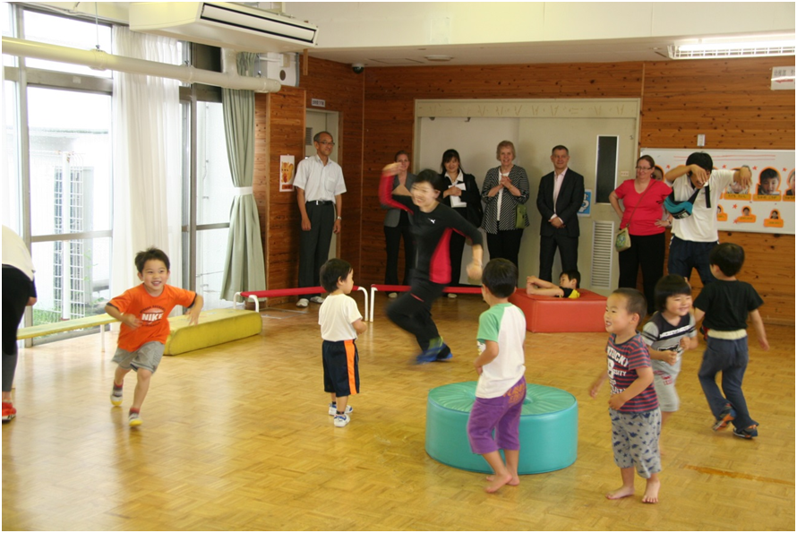 研究者4名とアメリカ知的・発達障害協会CEO及び通訳者は、下山校長から同校の概要の説明を受けた後、学校内を視察した。最初に訪れた幼稚部では、電車の模型で遊ぶ様子や集まり活動で音楽に合わせて走ったりする活動を見たりして幼児と触れ合った。幼児たちにとっても外国人と触れ合う貴重な体験となり、国際交流の良い機会となった。小学部では3年生の教室を訪れ、授業の様子や室内の配置等を見学した。研究員らは室内の整頓された様子を見て感嘆していた。その後幼児児童がランチルームにおいて昼食を食べる様子や、児童が栽培する田んぼの様子、生活学習のためのスペース(デモホーム)等を視察した。