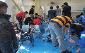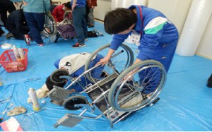 今回の整備会では20台の車いすを整備し、その整備内容は、車いすの車輪部のベアリング調整、清掃、グリス注入等の軸調整、更に、ブレーキ調整、各部の錆取りや調整である。作業はそれぞれのグループに大学生や高校生、本校専攻科生が混ざり、皆、自分なりにコミュニケーション方法を考え、意思疎通を図っていた。障がいのある生徒と障がいのない生徒が、アジアの子供たちに車いすを届けたいという目標に向かって、ともに笑い、ともに汗をかいている姿はとても印象的であった。