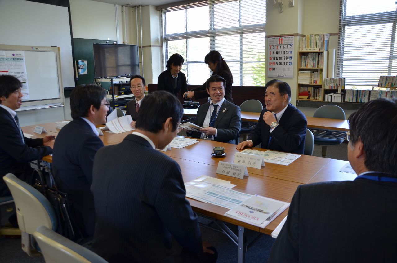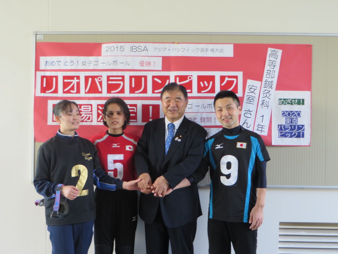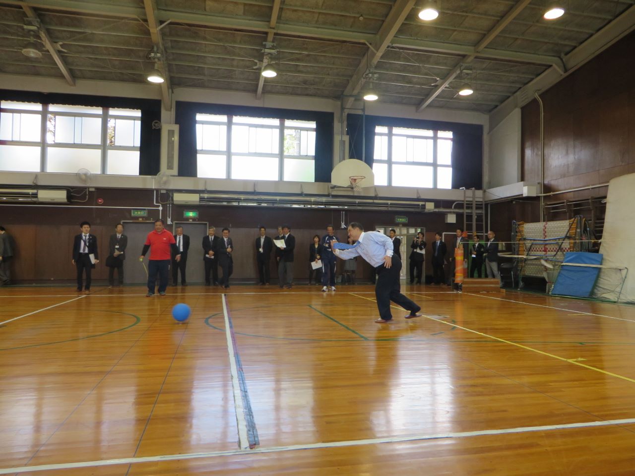 また、附属視覚特別支援学校においては、石隈教育長、澤田晋校長から概要説明を受けられた後、体育館において、体育(ゴールボール)の授業を視察され、生徒と意見を交換されました。そして、同校の体育館、グランド、プールなどの施設を視察され、本学関係者とパラリンピック教育の取組みについて意見を交換されました。