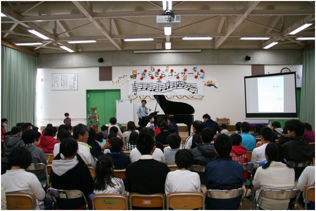 同校は知的障害を伴う自閉症児を対象とした学校で、幼稚部と小学部を設置している。今回は、子供たちに生の演奏に触れる機会とすること、本校幼児児童及び交流校の幼児児童との交流の場を設けることで本校への理解の一助とすることなどを目的として、作曲家でありピアニストでもある谷川賢作さんを迎えて実施した。