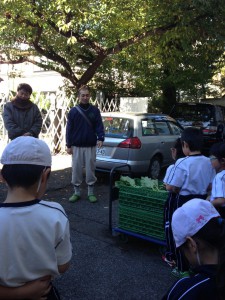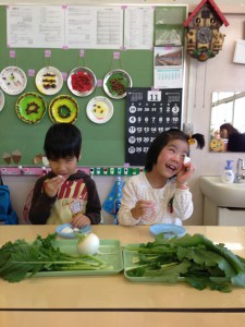 一方で、筑波大学附属学校間では子ども達同士の交流に取り組んでおり、坂戸高校の農場を視覚特別支援学校の子ども達が訪れ、農業体験を行った。農業体験では、坂戸高校で福祉を専攻する生徒たちが参加し、視覚に障害のある子ども達が活動を十分に楽しむことができるよう活動に工夫がなされていた。このような活動を通じ、坂戸高校で栽培した野菜を視覚特別支援学校の給食や寄宿舎での食材として提供することとなった。朝、坂戸高校で収穫したカブを受けとった視覚特別支援学校の子ども達は、「カブの葉っぱってちくちくするね。」「大きいカブ!」など、新鮮な野菜を前に目を輝かせていた。早速、当日の給食に登場したカブは、野菜の旨味が凝縮されていて、大好評だった。