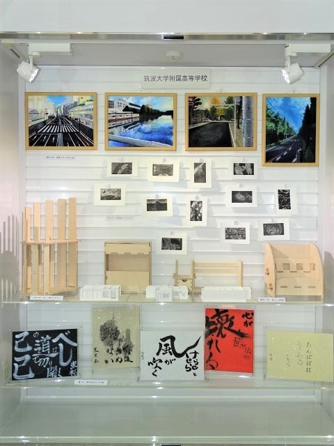 3か月毎に展示作品を入れ替えており、附属11校の特色が作品を通して伝わってきます。現在は、附属高等学校の生徒の作品を展示しています。
