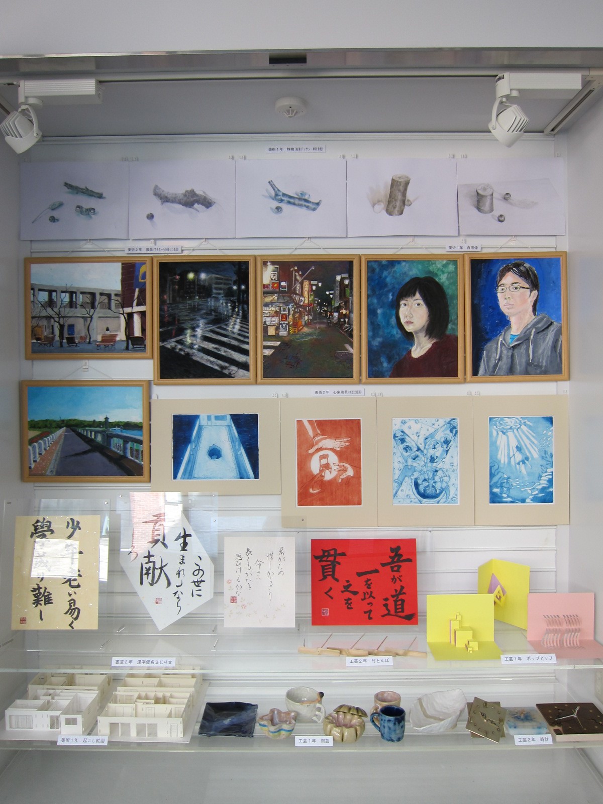 3か月毎に展示作品を入れ替えており、附属11校の特色が作品を通して伝わってきます。現在は、附属高等学校の生徒の作品を展示しています。