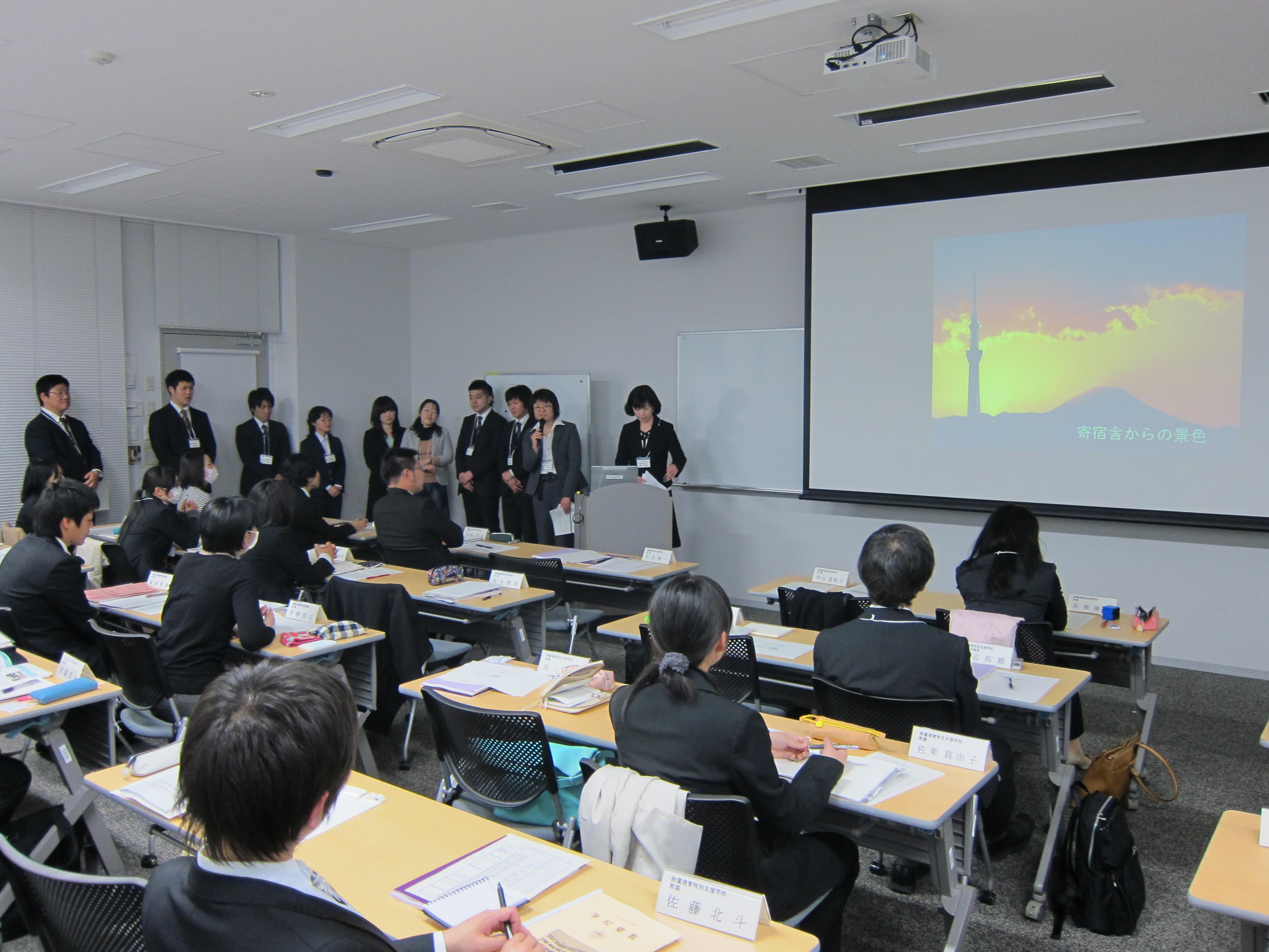 はじめに、東附属学校教育局教育長から「附属学校を取り巻く現状と課題」と題し、3つの拠点構想とともに、中期目標・中期計画の達成のために附属学校の一員として取り組んでいくと共に、日本の教育をリードしていくための研究と実践に取り組んでいって欲しい旨の話があった。引き続き、各新任教員から、自校についての紹介及び新任教員として今年度、取り組んできた事について発表があり、新任教員として1年たった自分を振り返る良い機会となった。その後、熊谷研修委員会委員長をはじめとする指導教員を交え、自由討論を行い、大学における附属学校としての役割や他の附属学校との連携などについて、活発な意見交換が行われた。交流会終了後には懇談会が行われ、今回の交流会をきっかけとして、附属学校教員同士の交流を深めていっていただきたい。