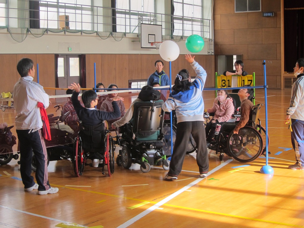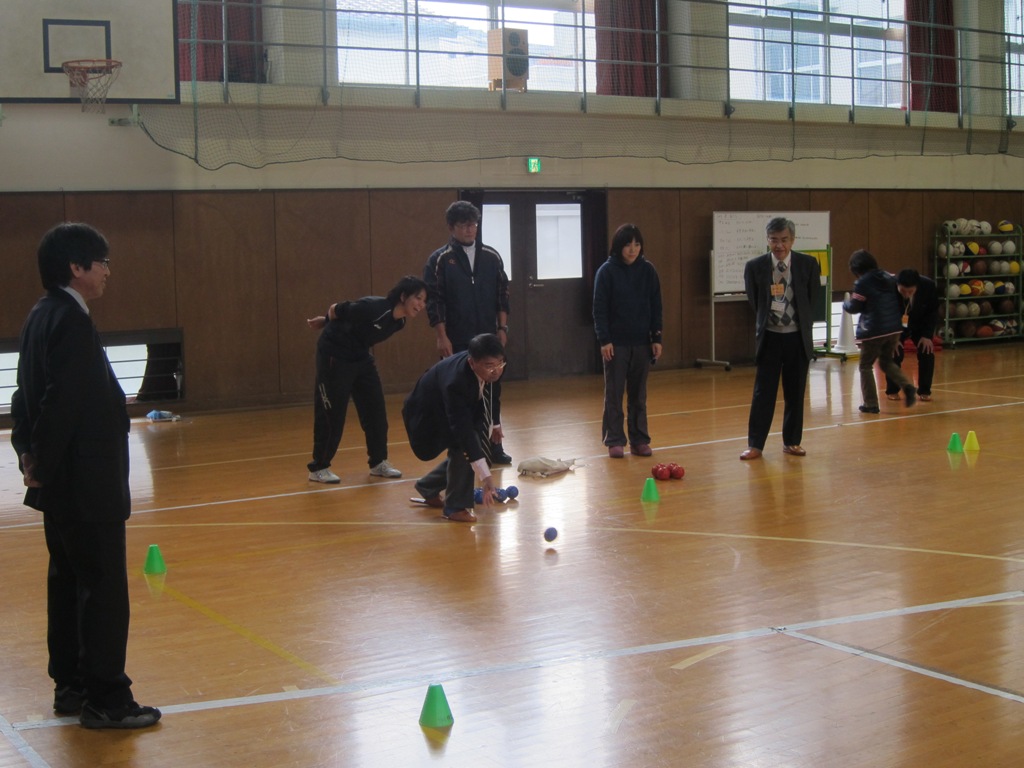 給食をはさみ、午後は施設併設学級に移動し、入院先である療育センターから通う児童生徒の授業も参観。そして再び本校に移動し、最後は障害者スポーツ「ボッチャ」を体験した。「ボッチャ」とは、的玉(白玉)を目標に赤・青両チームが玉を近づけ合うという競技である。今夏のロンドンパラリンピックにおいて、同競技の日本代表として会場校の卒業生が活躍したこともあり、今回の体験となった。短時間ではあったが、参加者と会場校の教員が一緒になって競技に熱中し、一投ごとに盛り上がる中で、参加者の間に一体感が生まれたように感じられた。