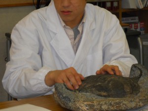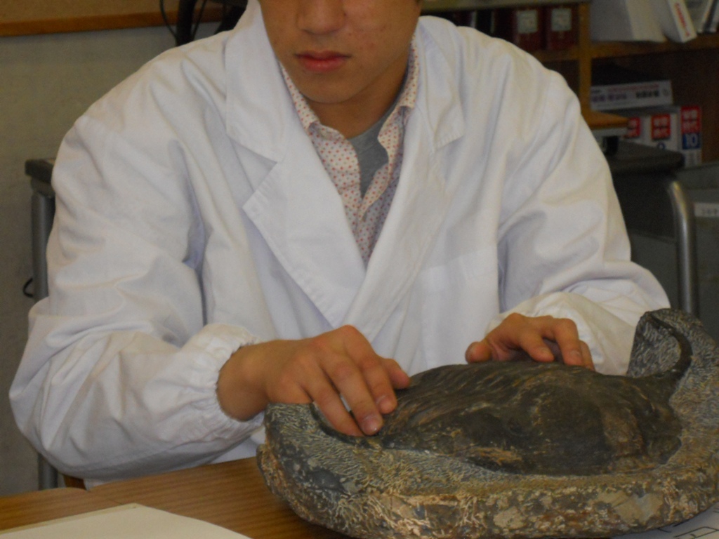 京都大学総合博物館所蔵の様々な古生物(三葉虫)の化石標本を触察・観察し、それらの形態の特徴から、生物の多様性と歴史的変遷を考察することを目的とした。実際の三葉虫の化石の触察・観察と大野教授の説明に古生物の世界に引き込まれていった生徒たちは、球状の防御姿勢のままの三葉虫の化石や40㎝もある三葉虫の化石に驚くと共に、身を乗り出して授業を受けていた。
