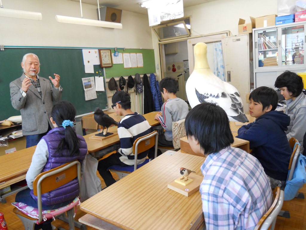 タッチカービングとは、生物学的に正確かつ精密に彫られ、姿や形を指先で触って確認し、記憶していく道具として作られた鳥の彫刻のことである。視覚に障害のある子どもたち、特に全盲は物に触って形を認識していくが、鳴き声で野鳥の世界を楽しむことはあっても、鳥を実際に触ったことがない子どもたちにとっては、貴重な経験となった。身近であって大きさが異なるメジロ、スズメ、ハクセキレイ、キジバト、ハシボソガラスを触察し、鳴き声や解説を聞き、それぞれの特徴をつかんでいった。また、保護活動のために使われたアホウドリのデコイ(模型)を触り、「アホウドリってこんなに大きいんだ」、「足に水かきがある!」と驚きの声が挙がっていた。教室での授業の後は、外に出て、実際の野鳥の声を聞きながら、内山氏の説明に耳を傾けていた。当出前授業の様子は、後日、テレビ放映された。