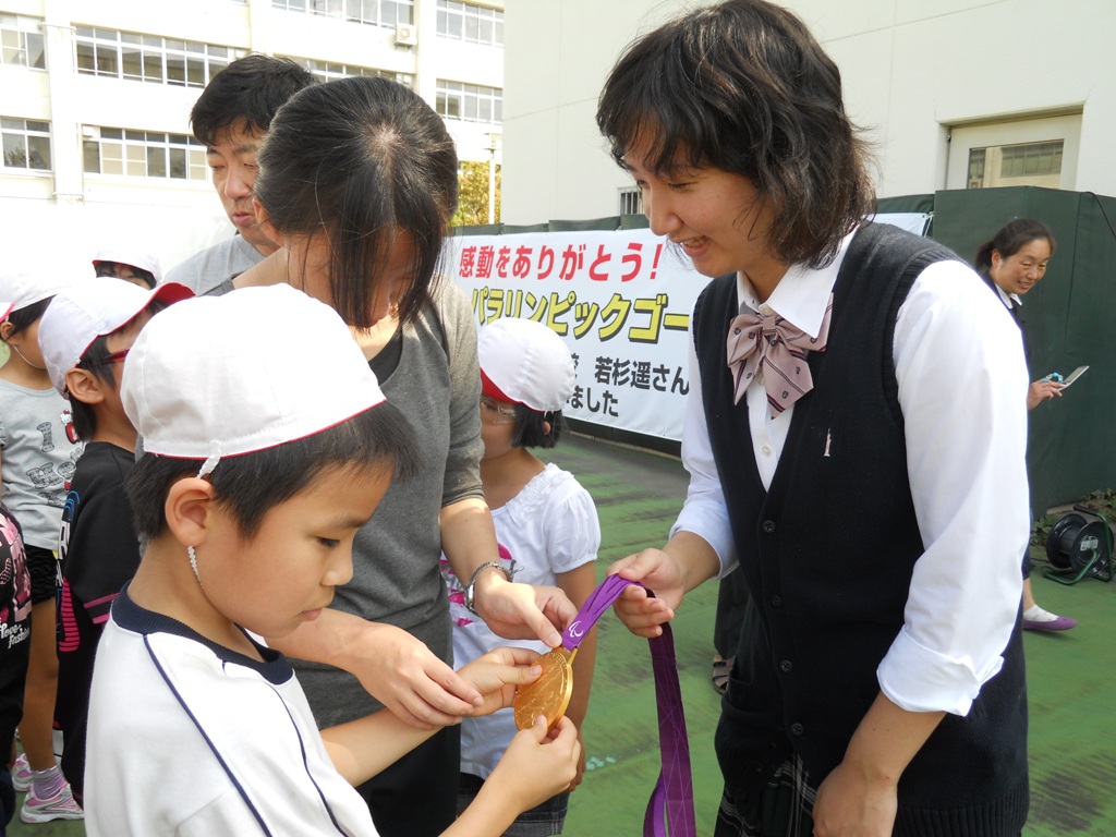 帰国後の9月14日、同校のグランドでパラリンピック報告会を行ったが、筑波大学附属学校教育局の東照雄教育長(副学長・理事)もお祝いに駆けつけた。若杉さんからは、「多くの皆さんの応援のおかげで金メダルを取ることができ、本当に嬉しいです。4年後のリオデジャネイロでのパラリンピックではチームの中心として引っ張っていけるよう頑張りますので、今後も応援をお願いいたします。」と力強い挨拶があり、皆からの大きな歓声と拍手を浴びていた。報告会後、小学部生を中心に金メダルを触り、口々に「やったー、初めて触った。」、「重たいね。」と感激の様子だった。また、同日の夕方には、寄宿舎において祝賀会が開催され、生徒と教職員手作りのくす玉を割り、祝福を受けた。
