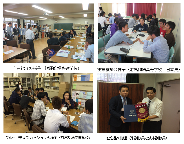 午後の附属駒場高等学校では、両校生徒の自己紹介の後、上海中学の1人ずつに駒場の生徒のバディが付き、グループ毎に5時間目の古文、日本史、6時間目の物理、化学、地学の授業に参加し、授業を通じた交流を行った。その後、4グループに分かれて環境問題(PM2.5等)や生徒交流による科学技術の進展への期待などについてグループディスカッションを行い、最後にグループ毎にそれぞれの学校代表から発表が行われた。
