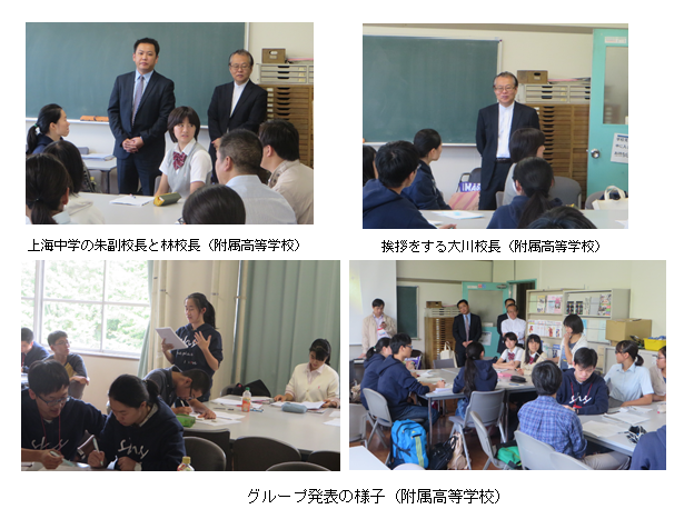 午前中の附属高等学校では、両校生徒の自己紹介から始まり、上海中学の生徒代表から挨拶、附属高校の大川校長から今回のプログラムに対する期待が述べられた後、4グループに分かれて、日本と中国の生徒交流による環境問題や科学の未来などをテーマにグループディスカッションを行い、最後にグループ毎にそれぞれの学校代表から発表が行われた。