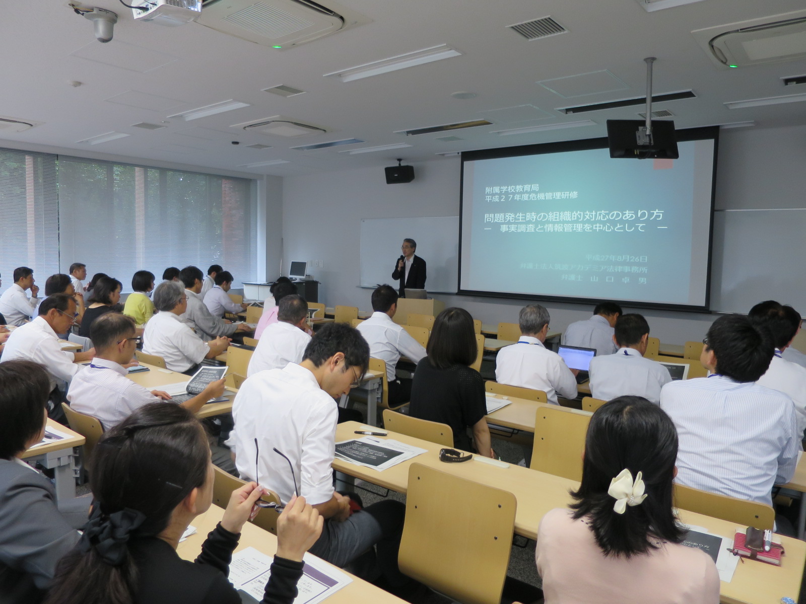 当日は附属学校、附属学校教育局及び社会人大学院の教職員70数名の参加者があり、活発な質疑応答・ディスカッションも行われ、さらなる危機管理意識の向上に繋がる研修となりました。