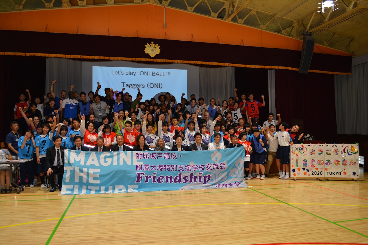 19日午後、附属大塚特別支援学校を舞台に学校訪問セッションが行われました。学校訪問セッションには、ウ・チンクオIOC理事、セルミャン・ウンIOC理事、エリザベス・マシューIOC OVEPプログラムマネージャー、エミー・シュワールOVEPプログラム戦略担当および真田久教授が出席し、附属大塚特別支援学校が考案したアダプテッドスポーツ「タグ柔道」、大きなボールを転がして鬼ごっこのように追いかけあう「おにボール」を附属大塚特別支援学校中学部、高等部の生徒、附属坂戸高等学校の生徒、TIAS学生が参加しオリンピック・パラリンピック教育の実践が行われました。