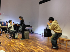第1部では脚本家・演出家・小説家の藤井清美(ふじいきよみ)氏に、「3年後の自分に感謝されたい」というタイトルで講演をいただきました。筑波大学の卒業生でもある藤井氏は卒業後、演劇講師として活動する中で外見や身体の状態が、その人の表現の可能性を奪ってしまう現実に強い違和感を覚えたそうです。俳優になることは決して容易ではなく、誰もがその道に進めるわけではありませんが、少なくとも「最初のスタートラインに立てない」という状況はあってはならない。そのために、努力したいと思ったときに学び、挑戦できる場を用意し続けることが重要であると考えておられます。児童生徒の障害に配慮し、優しい言葉でゆっくりと力強くお話しくださいました。また、第1部の最後では障害当事者である俳優の小藪伸也(こやぶしんや)氏、松下奈津希(まつしたなつき)氏、丸山晴生(まるやまはるき)氏による劇「推しの雑誌」が披露され、観客から大きな拍手が寄せられました。