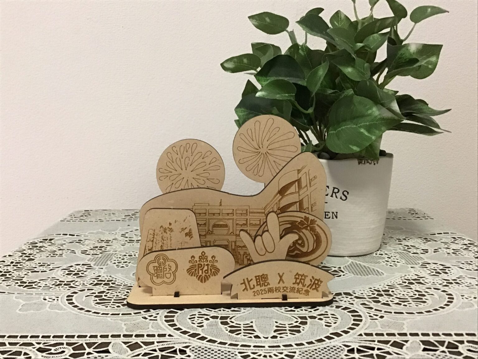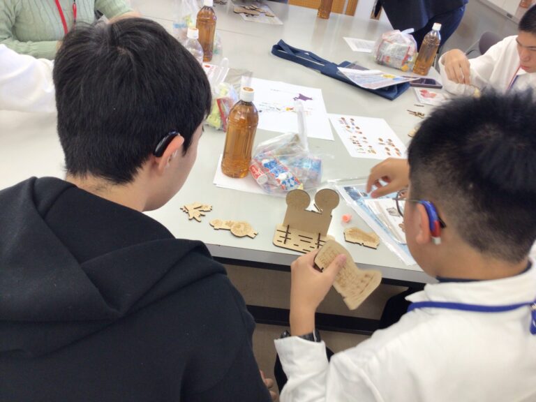 次に、作品交流として、記念オブジェを両校の生徒が協力して組み立てました。このオブジェは、台北市立啓聡学校の生徒がデザインし、レーザーカッターで切り抜き、持参してくださいました。