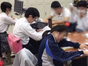 10月14日(火)、本校中学部3年生の生徒12名と、都立八王子盲学校の4名の生徒が、社会科の授業の一環としてオンライン交流授業を行いました。