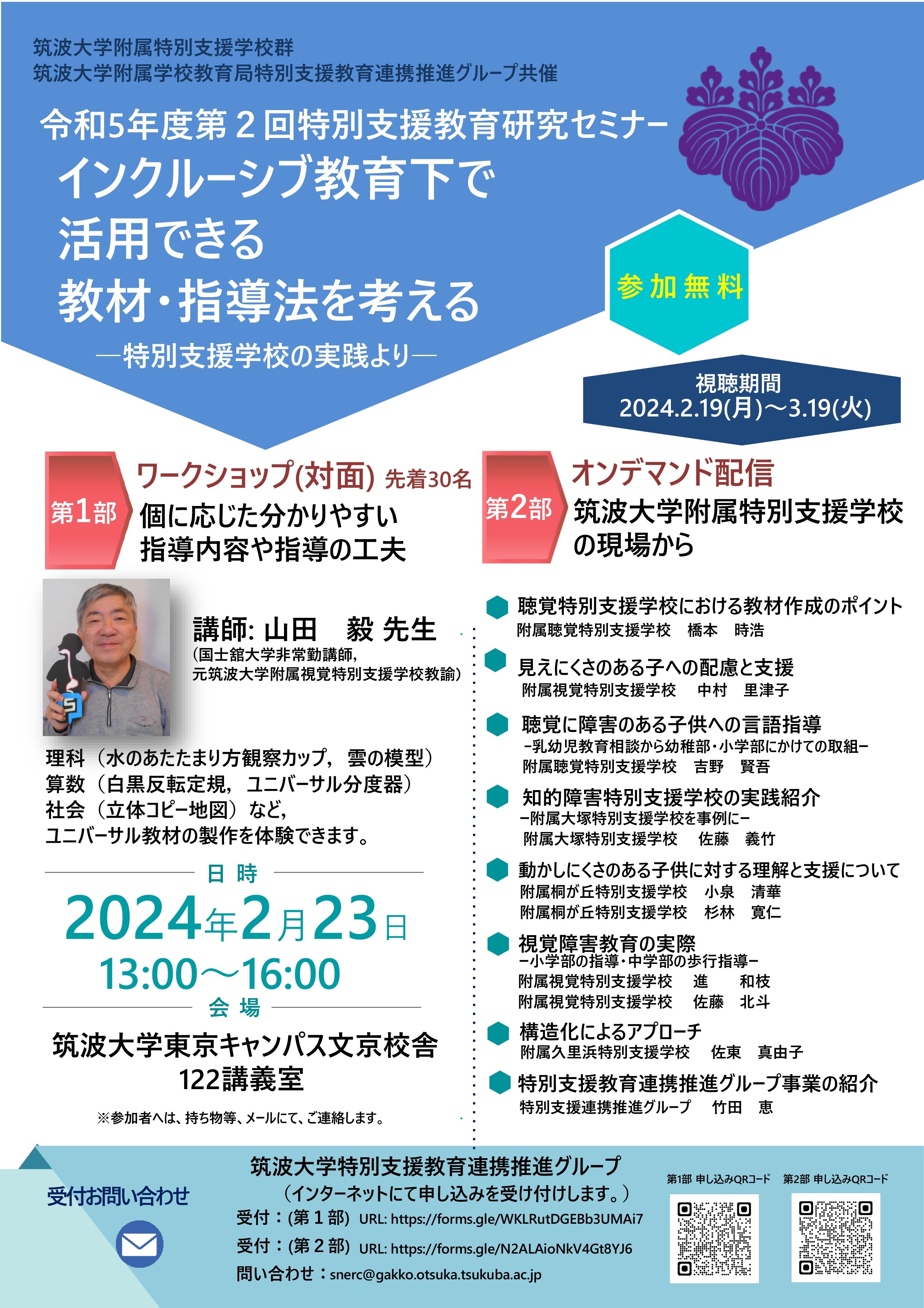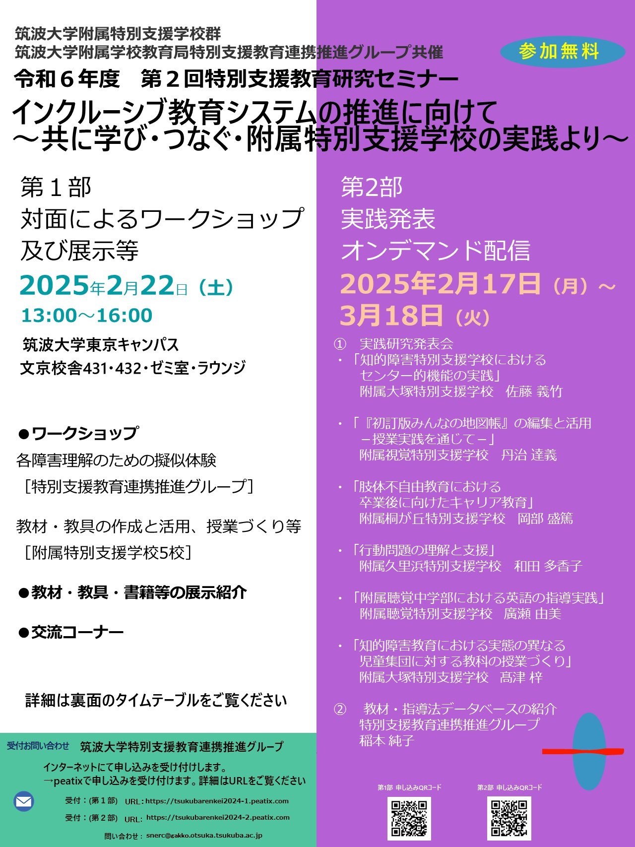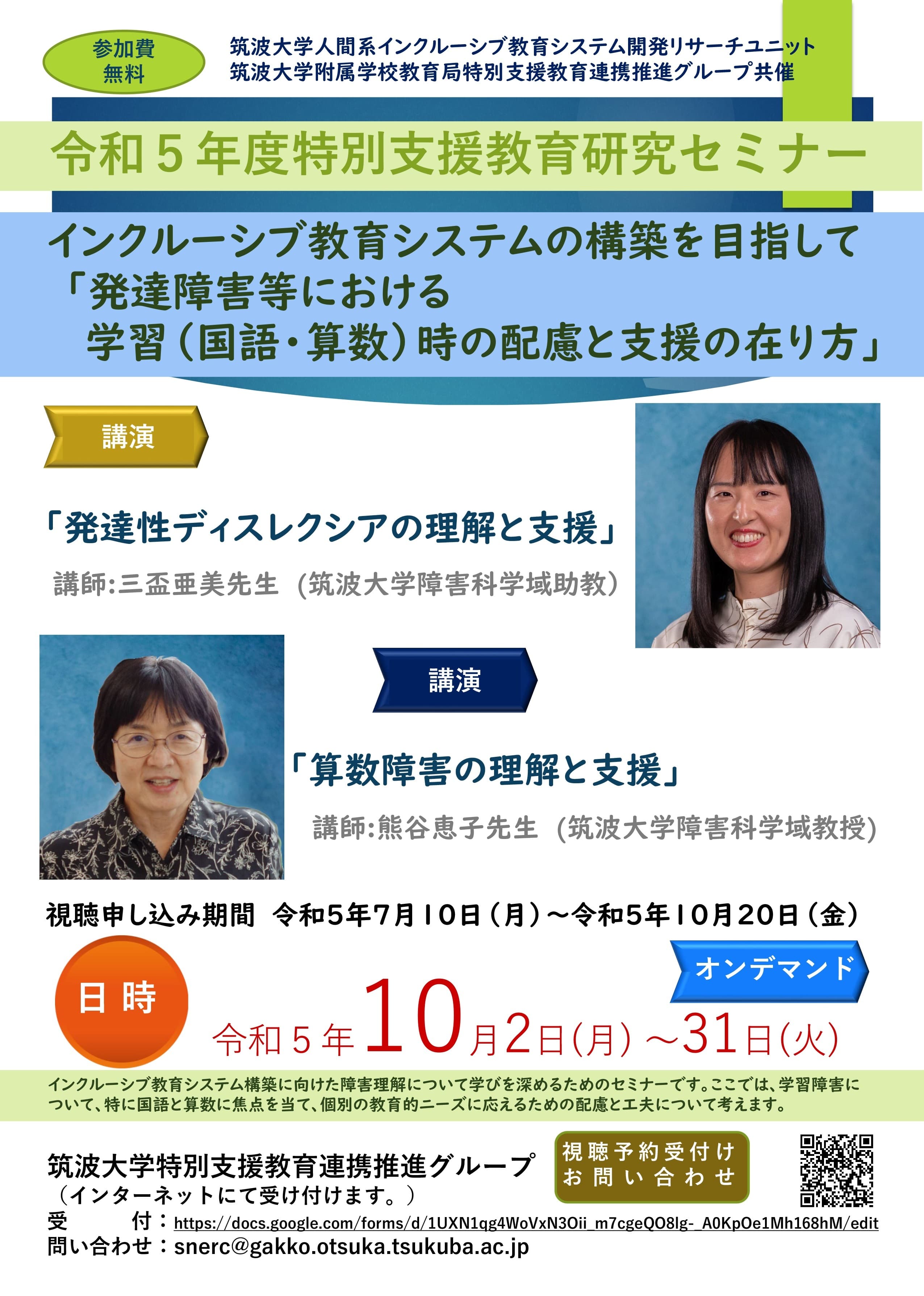 令和6年10月1日(火)から、31日(木)まで、第1回特別支援教育セミナー(筑波大学人間系インクルーシブ教育システム開発リサーチユニットとの共催)を開催します。今回のテーマは